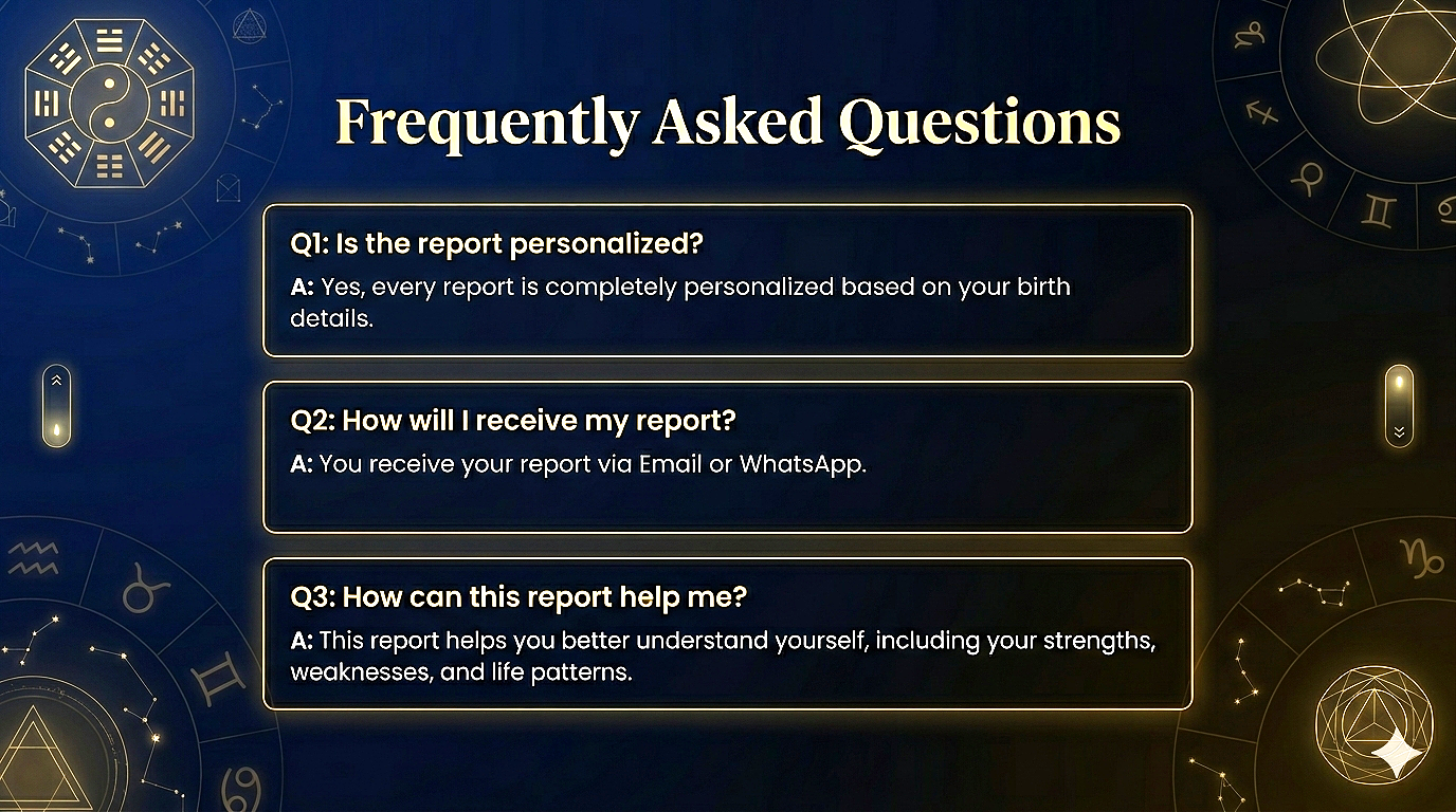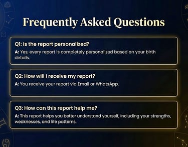 1. Personal Year analysis for the next 5 years 2. Complete Date of Birth Analysis 3. Loshu Grid Analysis 4. Name Analysis 5. Missing Number Analysis 6. Repetitive Number Analysis 7. Love & Relationships, Marriage, Career, Finance & Health Analysis 8. Mahadasha details 9. Birth Year, Month Number, Sun Sign details 10. Lucky & Unlucky Numbers, Lucky & Unlucky Colors 11.Missing & Available number significance & impact 12 Missing Number Remedies 13. Repetitive Number Remedies 14. Birth Number Remedies 15. Vastu Dosha as per missing numbers